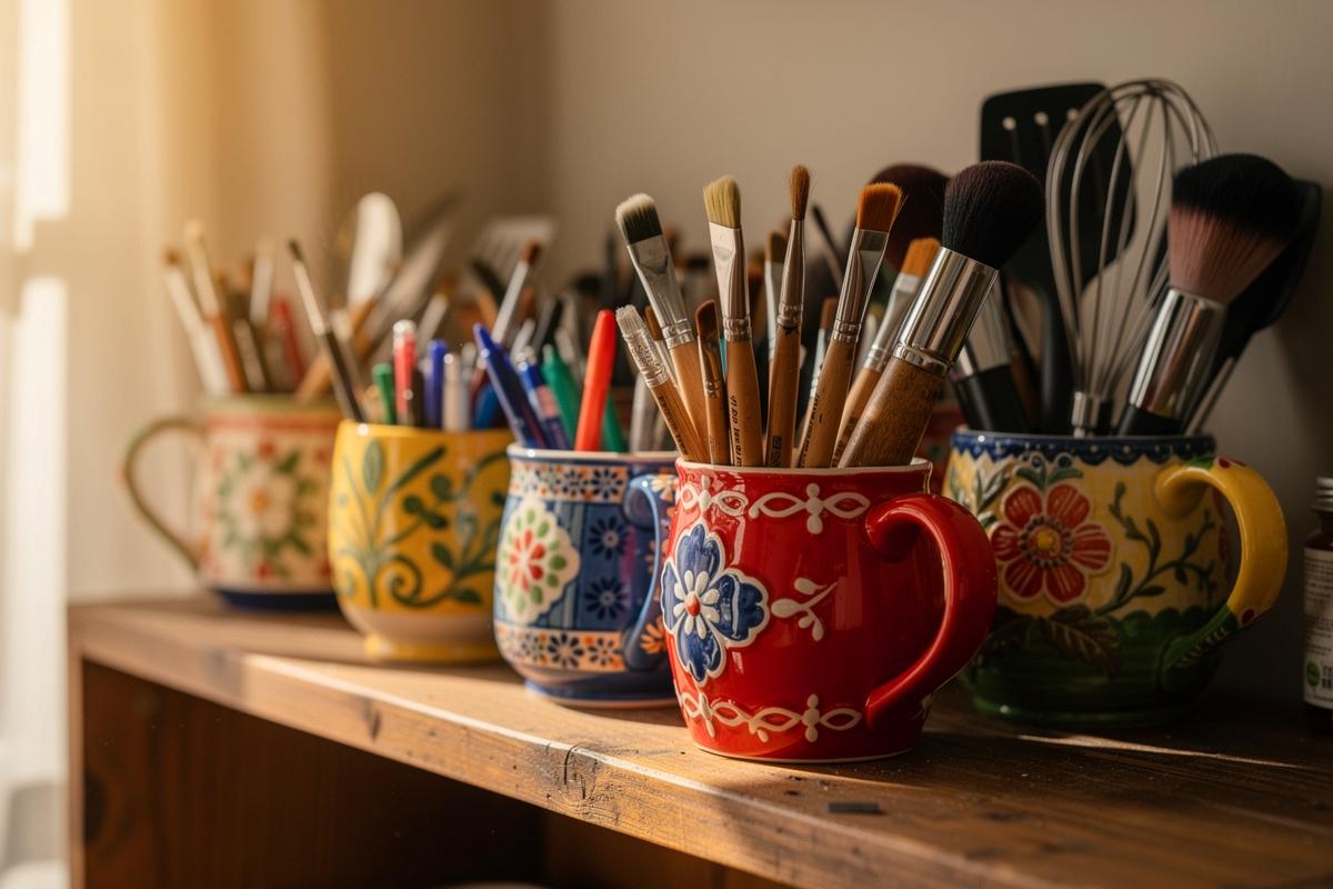 - 🔄 Vom Staubfänger zum Ordnungshelfer: Ungenutzte Tassen werden durch Upcycling zu praktischen und individuellen Organizern für Stifte, Kosmetik oder Kleinteile umfunktioniert.